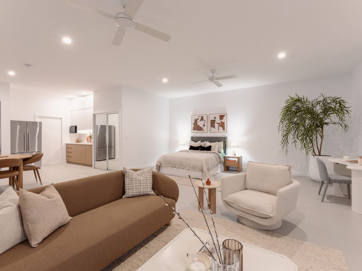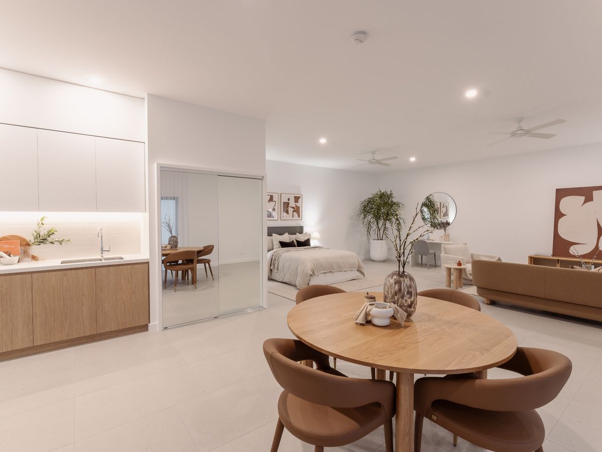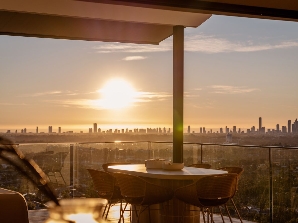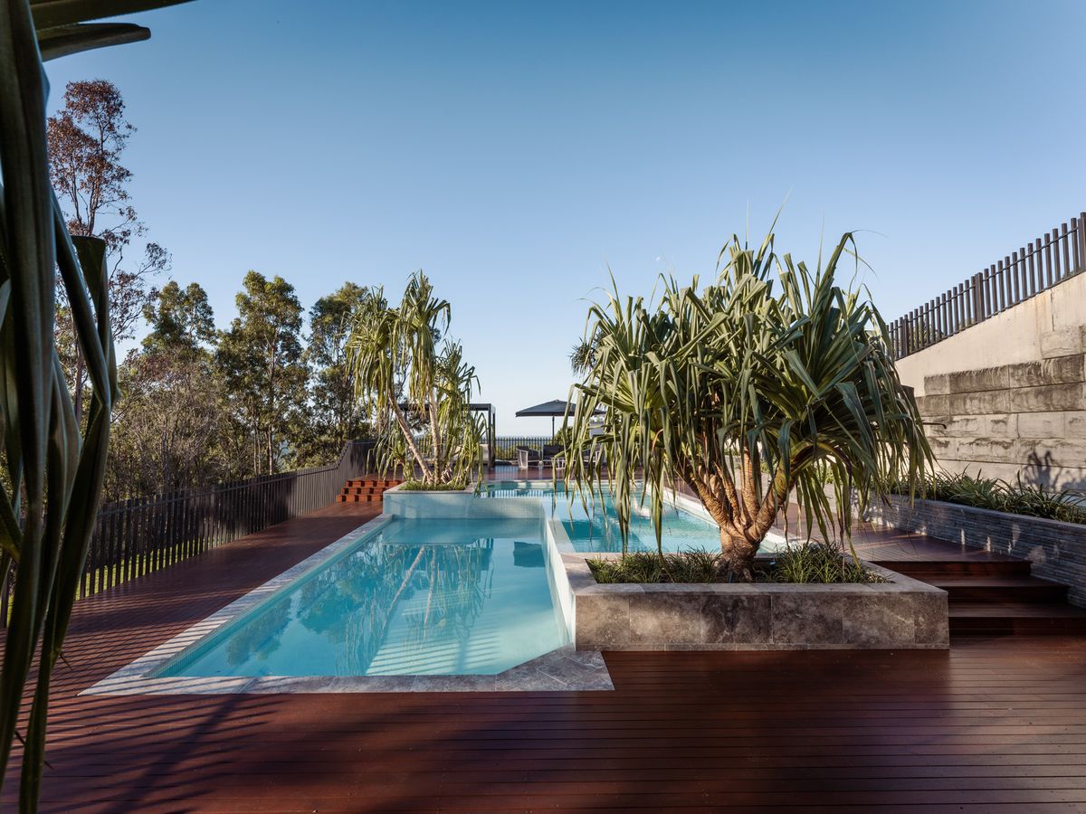 Above, residents enjoy access to a breathtaking elevated pool sanctuary — a shimmering oasis suspended among the treetops, with sweeping views across the Gold Coast skyline. The adjoining pool house and outdoor lounges offer spaces for relaxation and connection, bringing resort-style living to your doorstep.