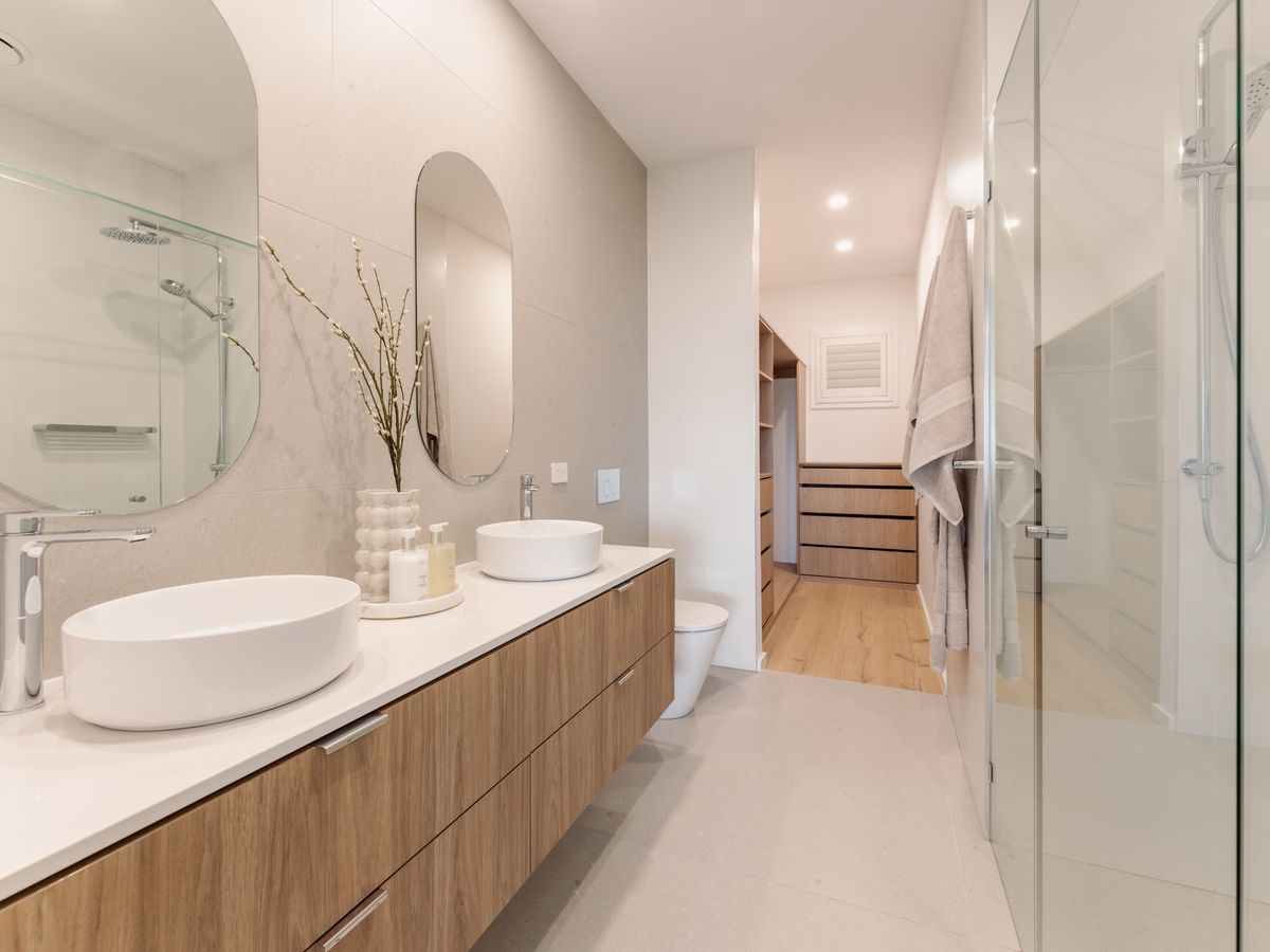 At the heart of the home lies a beautifully appointed designer kitchen, where timeless aesthetics meet modern performance. Engineered stone benchtops, premium appliances, gas cooking, integrated wine refrigeration, and soft LED feature lighting create an environment perfectly suited for both entertaining and everyday living.